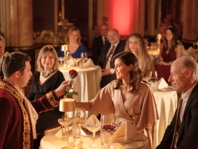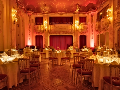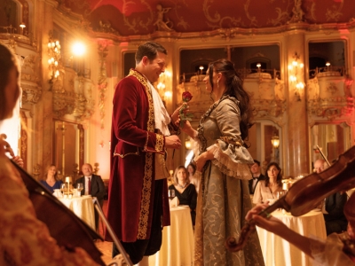 会場であるグランド ホテル ボヘミア内の「ボッカチオ・ボールルーム」は1927年に誕生し、社交界の寵児たちが集った、豪華で格式高いホールです。この美しいネオ・バロック様式の舞踏場は、ジョヴァンニ・ボッカチオとその『デカメロン』にちなんで名付けられました。モーツァルトの音楽を聴きながらディナーを楽しむ時間は、まるで過去にタイムスリップしたかのような特別な体験になります。